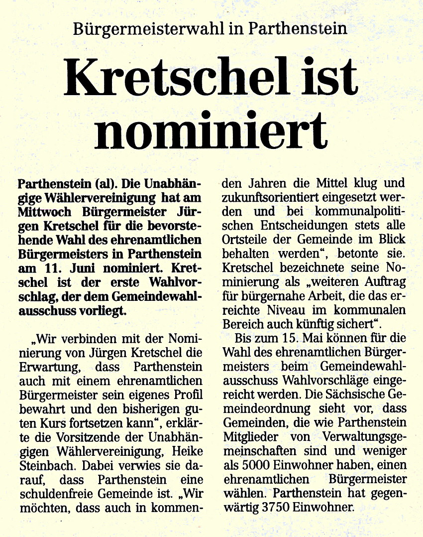 Parthenstein wählt diesmal einen ehrenamtlichen Bürgermeister. Obwohl in den vergangenen Jahren sehr erfolgreich gewirtschaftet wurde und die Gemeinde kaum nennenswerte Schulden hat, ist sie doch zu klein, um nach der Sächsischen Gemeindeordnung einen hauptamtlichen Bürgermeister haben zu dürfen.
