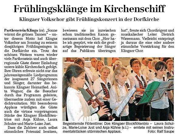 (rl) „Die Sonne wärmt die grünen Tannen“ – so lautete das Motto, unter dem der Volkschor Klinga am vergangenen Sonntag sein traditionelles Frühjahrskonzert gab, wie immer unter der bewährten Leitung des Großsteinbergers Dietrich Wiesemann.