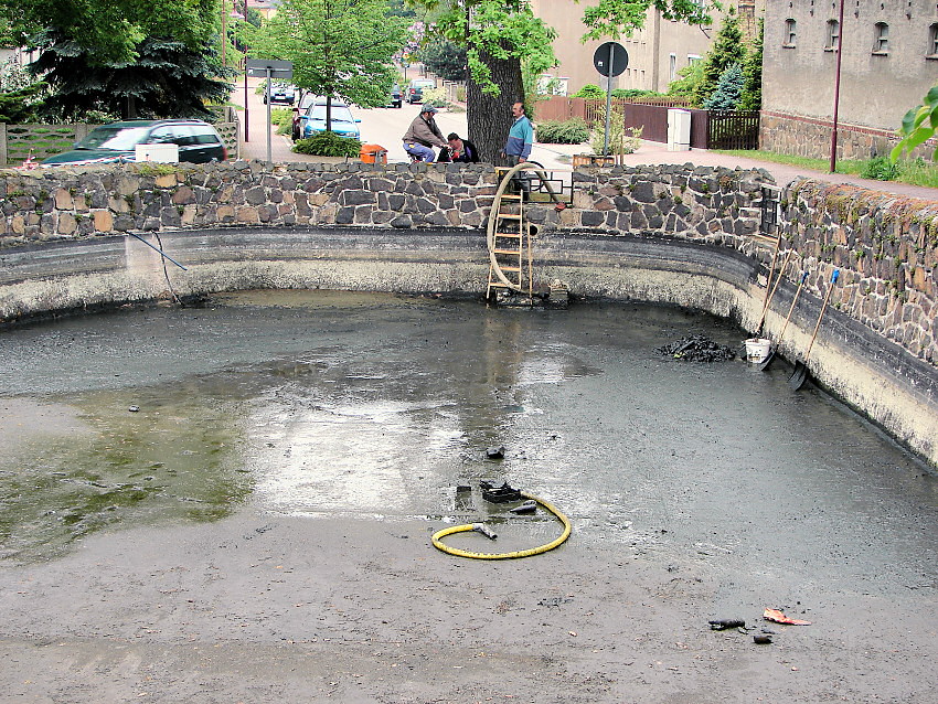 Zurzeit ist man dabei, den Teich zu entschlammen. Danach wird er mit Hochdruckreinigern gründlich gereinigt, damit alle Risse und undichten Stellen repariert werden können.