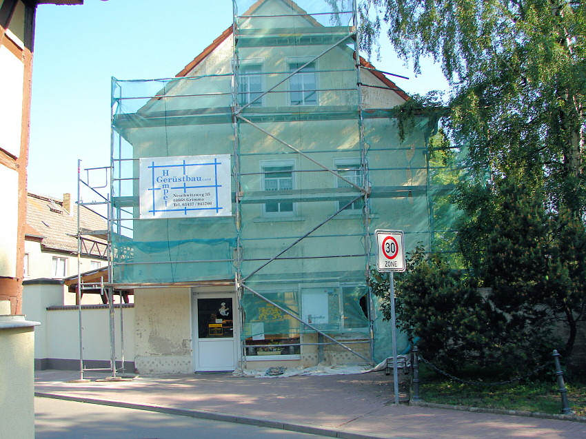 (rl) Günter Laube, Vermieter des Backwarengeschäftes an der Kirche, lässt das Haus neu verputzen. Zurzeit bringt das einige Beeinträchtigungen für Verkäuferin und Kundschaft. Doch wenn das Haus in neuem Glanz erstrahlen wird, ist das schnell vergessen und der sicherlich freundliche Anblick der neugestalteten Fassade bleibt uns dann für lange Zeit.