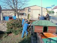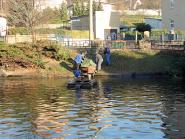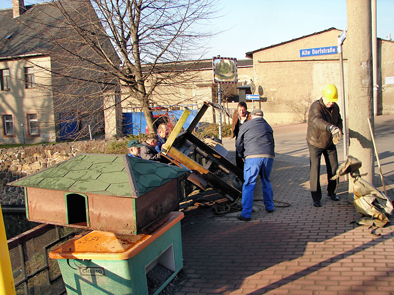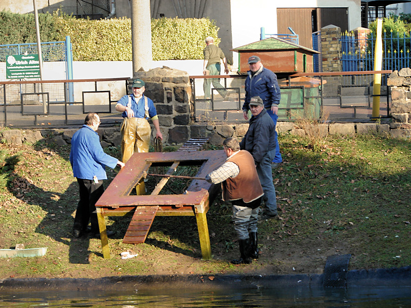 Danach brachte man das Entenhaus an Land – eine mühevolle Arbeit. Auch Rolf Kanitz und Lutz Oelschlägel haben kräftig mit angepackt.