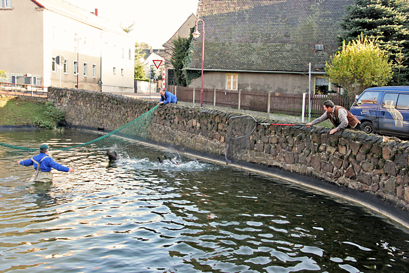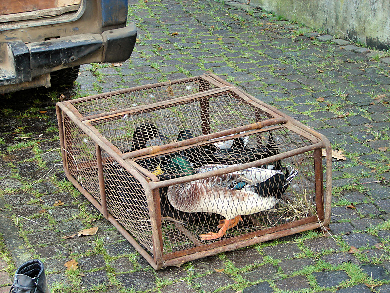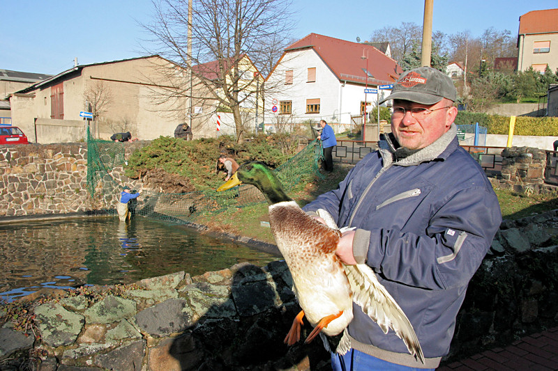 Ausgerüstet wie Hochseefischer fingen sie zuerst die Enten ein. In einem Drahtkäfig wurden diese mit dem Auto nach Pomßen zum Überwintern gefahren.