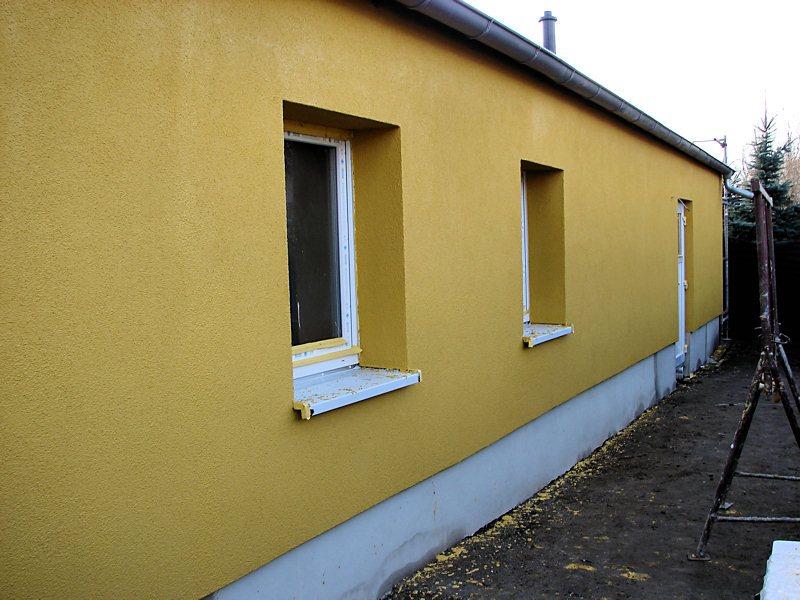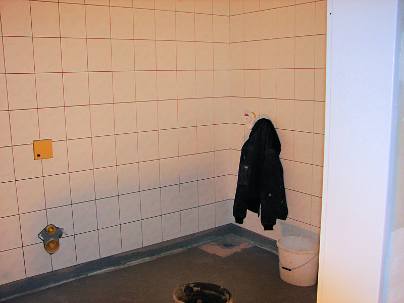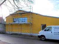 (rl) Seit heute hat die Turnhalle rundum eine neue Fassade. Während im Innern noch die Fliesenleger, Elektriker und Installateure am Werke sind, wurde in den letzten Tagen der neue Putz auf die Fassade aufgebracht. Man sieht an der Farbgestaltung, dass die Turnhalle mit der Schule ein Ensemble bildet.