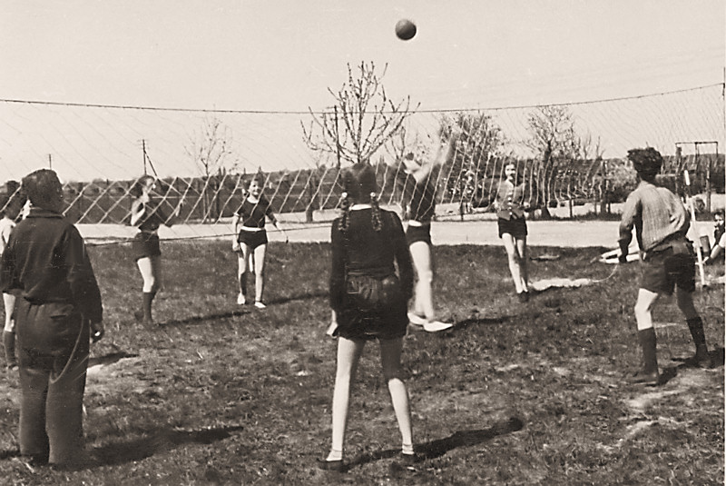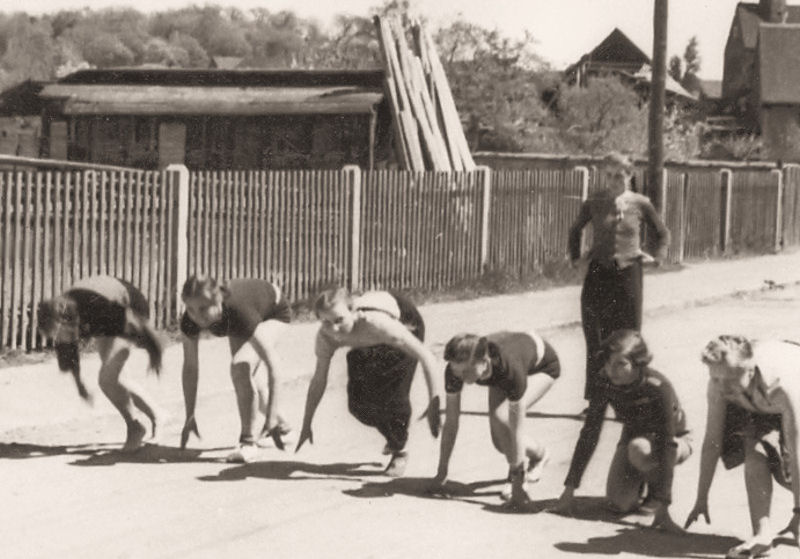 Und hier noch einige historische Aufnahmen: zu sehen ist die zur Turnhalle umgebaute Maschinenhalle, die Baracke am Sportplatz, ein Volleyballspiel auf der Wiese (man beachte die tolle Sportkleidung, über die sich damals keiner mokierte), und ein 60-m-Lauf auf der Straße vor der Schule. Die Wohnblöcke existierten zu dieser Zeit noch nicht.