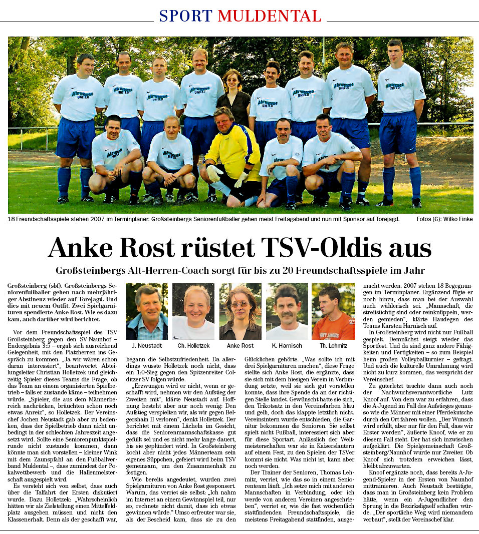 Neue Spielergarnituren für Alte Herren Veröffentlicht am 13. Juni 2007 von Ortschronist (rl) Die Alten Herren des TSV Großsteinberg werden wieder Aktiv. Zu diesem Zweck spendierte Anke Rost je zwei neue Spielergarnituren. Ein ausführlicher Artikel stand heute in der Muldentaler Kreiszeitung – sehen Sie selbst: