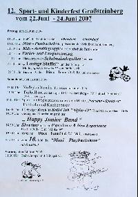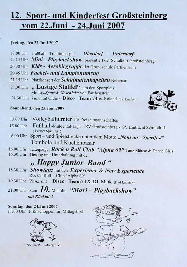 Sport- und Kinderfest Veröffentlicht am 20. Juni 2007 von Ortschronist (rl) Vom 22. – 24.6.2007 findet wieder das jährliche Sport- und Kinderfest des TSV Großsteinberg statt.Wie die Jahre zuvor ist wieder ein dicht gedrängtes Programm geplant. Doch sehen Sie selbst: