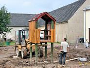 Dazu sind erhebliche Erdarbeiten notwendig. Man ist zurzeit dabei, zu planieren und die einzelnen, unterschiedlich konzipierten Platzteile einzurichten. Und so, wie es in den Arbeitsablauf passt, werden die Spielgeräte aufgebaut. Auch diese bestehen, wie in der Feldstraße, aus Robinienholz – Qualität fürs Auge und zum Anfassen. Die Spielgeräte der Firma Kästner kommen bei den Kindern aber besonders wegen ihrer natürlichen Struktur gut an. Da gibt es kaum rechtwinklige Linien, das Holz erlebt man so, wie es gewachsen ist.