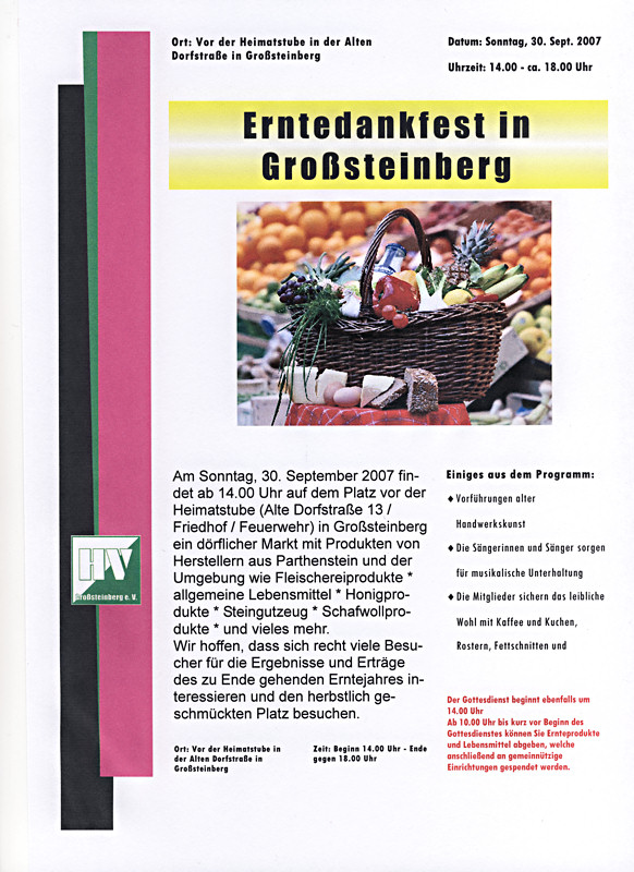 Beginn ist 14.00 Uhr. Ebenfalls 14.00 Uhr beginnt der Dankgottesdienst. Ab 10.00 Uhr können in der Heimatstube Ernteprodukte und Lebensmittel für die Kirche abgegeben werden. Sie kommen einer gemeinnützigen Einrichtung zugute.