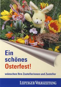 (rl) Heute morgen flatterte mit der Zeitung eine Osterkarte ins Haus. Darin wünschten die Zusteller der „Leipziger Volkszeitung“ ein schönes Osterfest – eine freundliche Geste, für die wir herzlich Dank sagen.