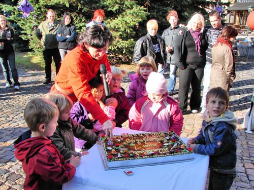 Mit dem Tortenanschnitt wurde die Feier eingeleitet und ein Lampionumzug soll sie beschließen.