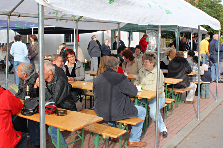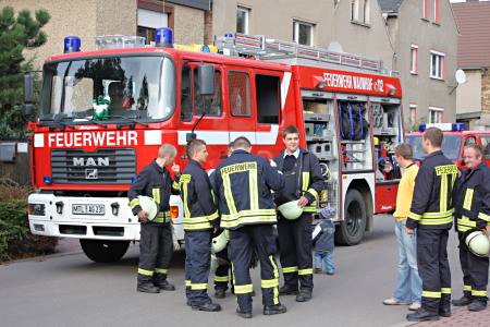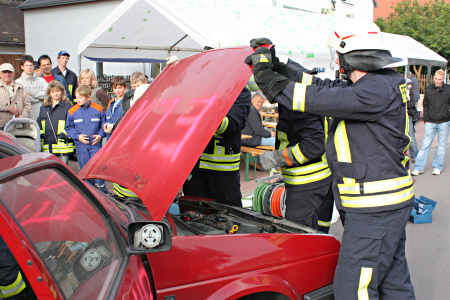 Am Nachmittag öffneten die Kameraden der Großsteinberger Feuerwehr ihre Türen für das interessierte Publikum. Großsteinberger und Gäste nutzten die Gelegenheit, zumal man ja dabei auch für das leibliche Wohl sorgen konnte. Den Feuerwehrkameraden war aber auch daran gelegen, ein wenig Werbung in eigener Sache zu machen. So sah man einige Vorführungen sowohl jugendlicher, als auch vor allem der Erwachsenen. Ein in seinem verunglückten PKW eingeklemmter Fahrer musste befreit und versorgt werden. Hier konnte man zeigen, dass man die modernste Technik beherrscht. Bei annehmbarem Wetter gestaltete sich der Nachmittag für Feuerwehr und Gäste zu erfolgreichen und angenehmen Stunden.