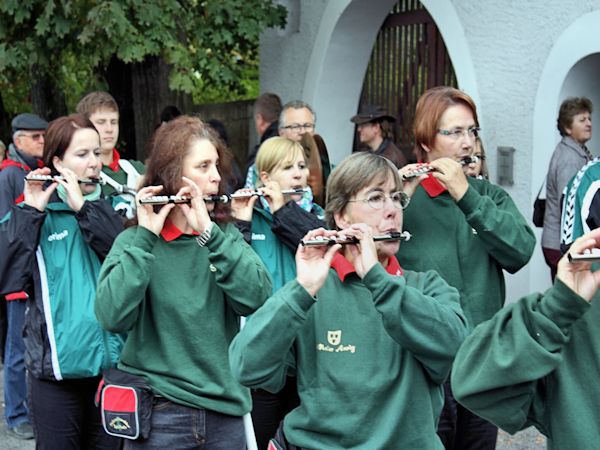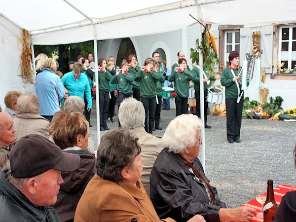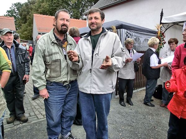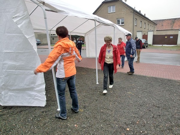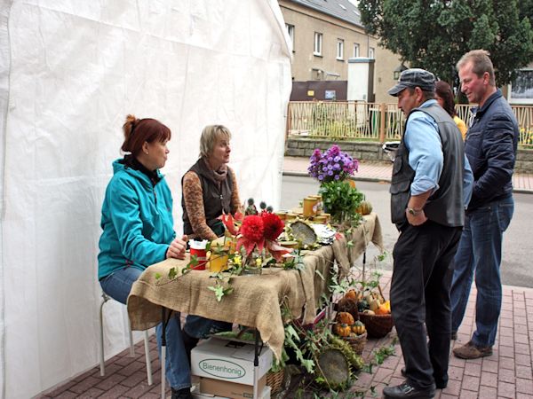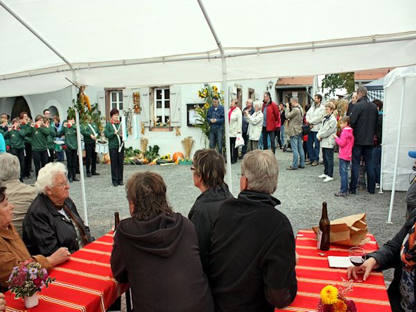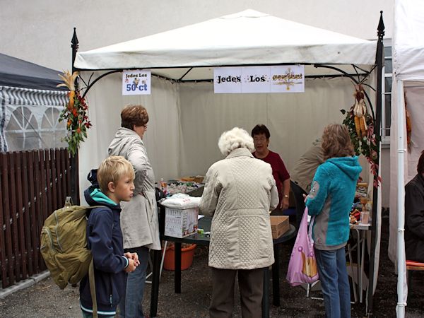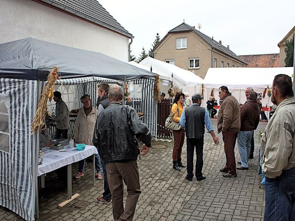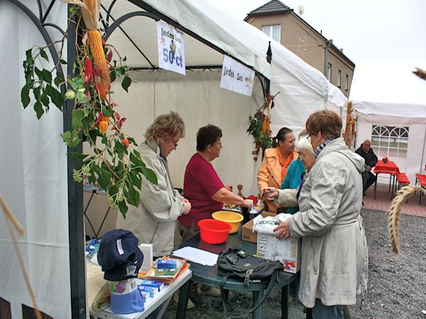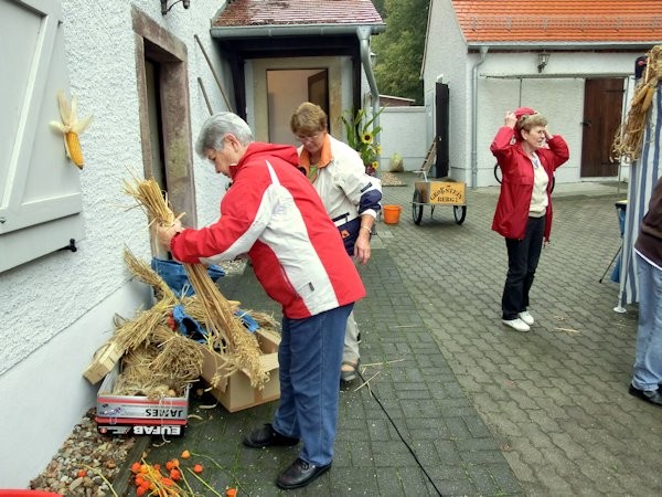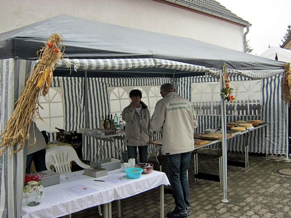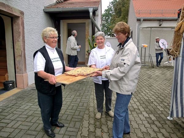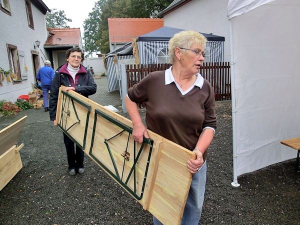 Der Heimatverein Großsteinberg hat wieder sein traditionelles Erntedankfest gefeiert. Erster bei den Festvorbereitungen war Josef Hirth, der schon in der fünften Stunde den Backofen anheizte. 8 Uhr begannen die Bäcker ihr Werk und so gegen neun kamen die übrigen Frauen und Männer, um die Festzelte aufzubauen und zu schmücken. Einen Extra-Pavillon bekam Lotti Mätzold, die mit Tochter Annegret eine Tombola betrieb. Da im Lostopf nur Gewinne lagen, gab es ordentlich Zuspruch.