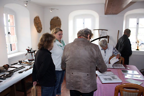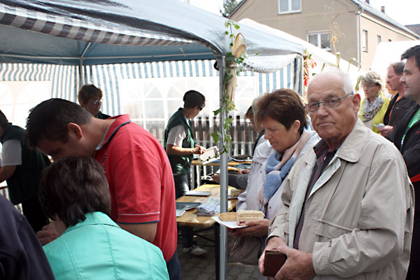 Inzwischen kümmerte sich Monika Langhof in der Bastelecke um die Kleinen. „So viel wie dieses Mal,“ meinte sie, „waren bisher noch nicht da.“ Auch die Ausstellung zum Thema „Altes Werkzeug von altem Handwerk“ wurde gut besucht. Hier den Beteiligten ebenfalls ein herzliches Dankeschön für die Bereitstellung ihrer Schätze. Obwohl der Backofen bis an seine Grenzen ausgereizt wurde, die Vereinsfrauen zusätzlich Kuchen gebacken haben und die Männer am Grill keine freie Minute hatten, konnten nicht alle Wünsche erfüllt werden. Der Großsteinberger Heimatverein ist eben keine Bäckerei und keine Gaststätte.