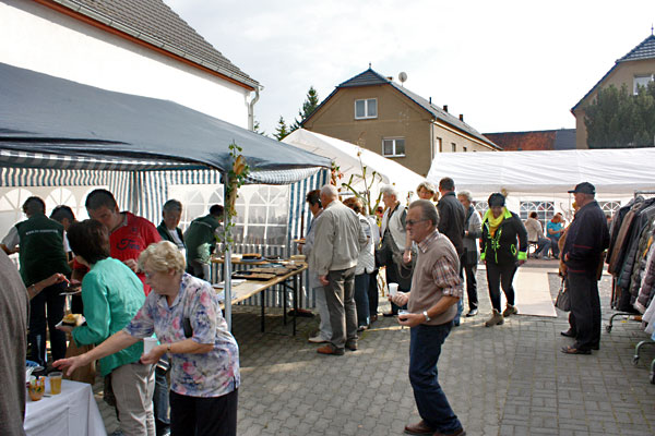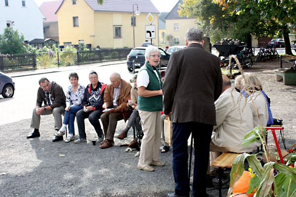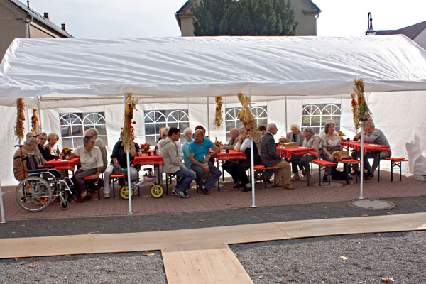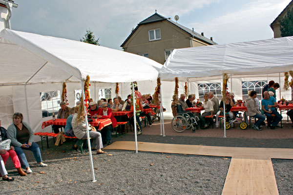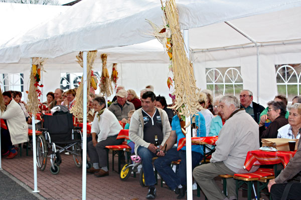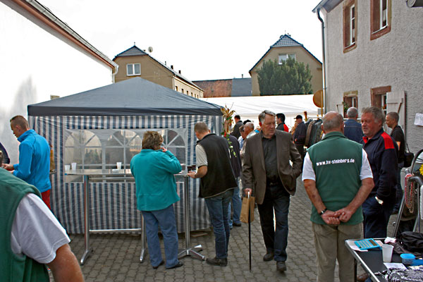 Herrliches Herbstwetter – der Himmel war blau und die Sonne zeigte sich von ihrer freundlichsten Seite. Der Heimatverein hatte zum Erntedankfest geladen und die Laune der Vereinsmitglieder war bereits beim Aufbau und Schmücken des Festplatzes prächtig. Jeder weiß, was zu tun ist und so hatte man alles fertig, lange bevor die Gäste kamen. Der Backofen rauchte schon seit fünf Uhr in der Frühe. Die Bäcker Werner Voigtländer, Wolfgang Calov und Josef Hirth hatte alle Hände voll zu tun. Die Zelte standen und auch der Grill war startklar. Und die Gäste kamen, nicht nur aus Großsteinberg. Dafür, dass Sie uns die Treue halten, möchten wir uns an dieser Stelle auch einmal herzlich bedanken. Ihr Besuch ist für uns der Dank für unsere ehrenamtliche Beteiligung an der Ausrichtung solcher Feste.