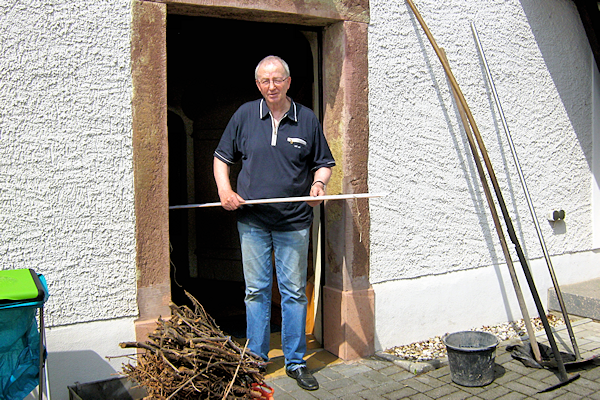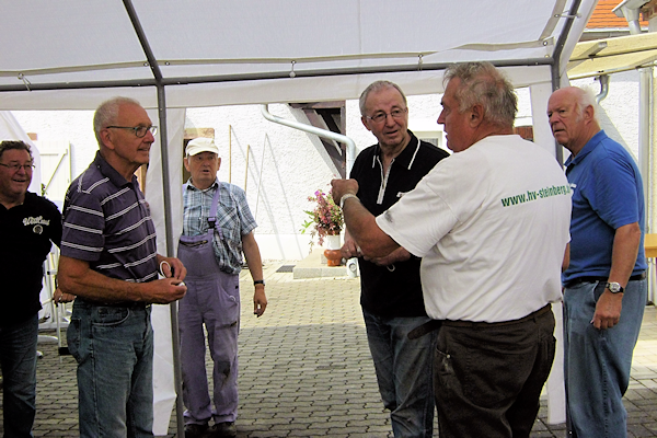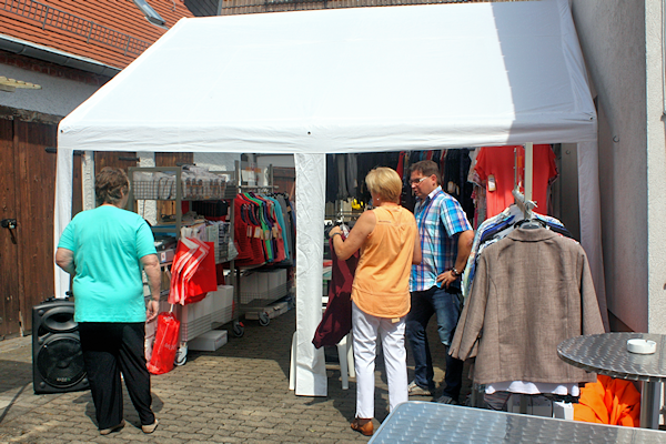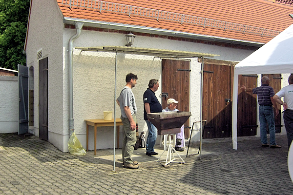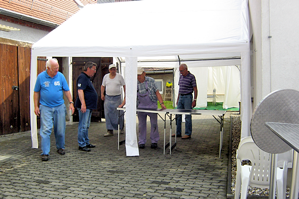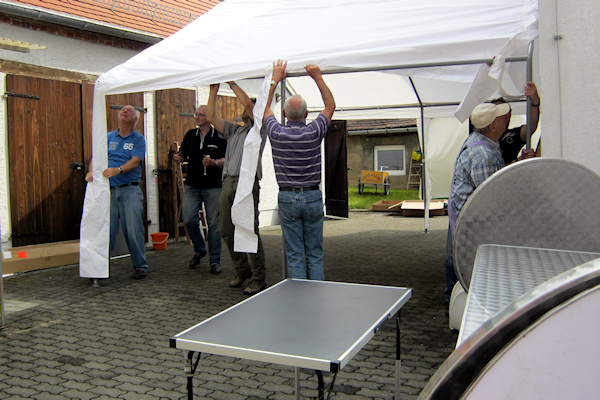 Die Bäcker hatten bereits am frühen Morgen begonnen, den historischen Backofen in Betrieb zu nehmen. Die übrigen Mitglieder trafen sich 9:00 Uhr zum Aufbau, Einrichten und Schmücken der Zelte. Als Problem stellte sich ein trotz Verbotsschild abgestellter PKW dar. Mit Hilfe der Polizei konnte die Halterin verhältnismäßig rasch zum Umparken veranlasst werden, so dass der Aufbau zügig vonstatten gehen konnte.