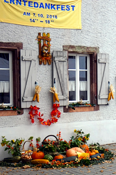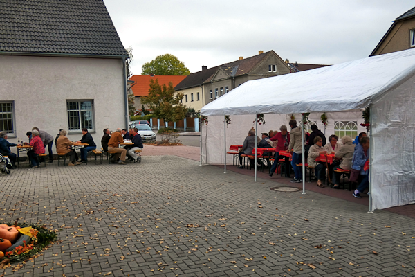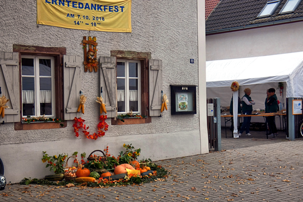 Der Himmel war bedeckt, die Temperaturen herbstlich, aber nicht kalt. Die Bäcker trafen sich schon am frühen Morgen, die übrigen Mitglieder kamen 9:30 Uhr zum Aufbauen und Schmücken. Dabei war das Schmücken in diesem Jahr eine schwierige Aufgabe, war doch vieles im Garten vertrocknet.