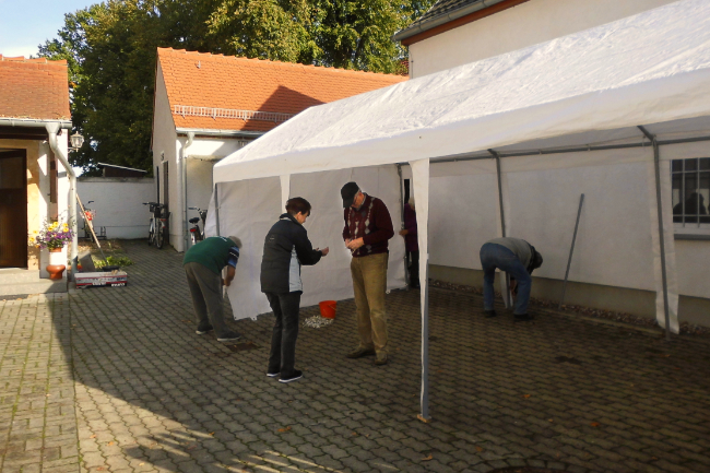 Wir hatten wiedermal Glück mit dem Wetter. Bis zum Wochenende regnete es und es war teilweise auch sehr windig. Am Sonntag dann war es trocken, Zeitweise schien auch die Sonne, doch es war sehr kühl. Unsere Mitglieder, die am Rost oder im Verkauf standen, bekamen das unangenehm zu spüren. Obwohl wir in diesem Jahr, dem Wetterverlauf geschuldet, verhältnismäßig wenig Blumen und Pflanzen zum Schmücken zu haben waren, brachte doch jeder etwas mit und so bekamen wir doch wieder einen schön geschmückten Festplatz. Hilfreich ist dabei, dass uns einige Nichtmitglieder mit Gartenfrüchten helfen – vielen Dank dafür.