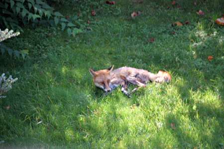 Monika und Rolf Langhof staunten nicht wenig, als sie zur Mittagszeit ins Haus gingen und aus dem Küchenfenster beobachten konnten, wie ein Fuchs im Gartenteich paddelte. Er zog sich mit Mühe heraus und legte sich daneben. Dann ging er zu einer nahestenden Tanne und versuchte, sich dort zu verkriechen. Es war eindeutig zu sehen, dass er entweder krank oder verletzt war. Auf Langhofs Anruf beim Rettungsdienst hin wurde der Jagdpächter informiert, der auch umgehend zur Stelle war. In diesem Falle betraf es den Großsteinberger Hans-Georg Uhlmann, der die Sache in die Hand nahm und alles weitere veranlasste. Tollwutgefahr bestand nicht. Das Tier litt, wie Uhlmann versicherte, an der Fuchsräude. Anfassen sollte man es dennoch nicht.