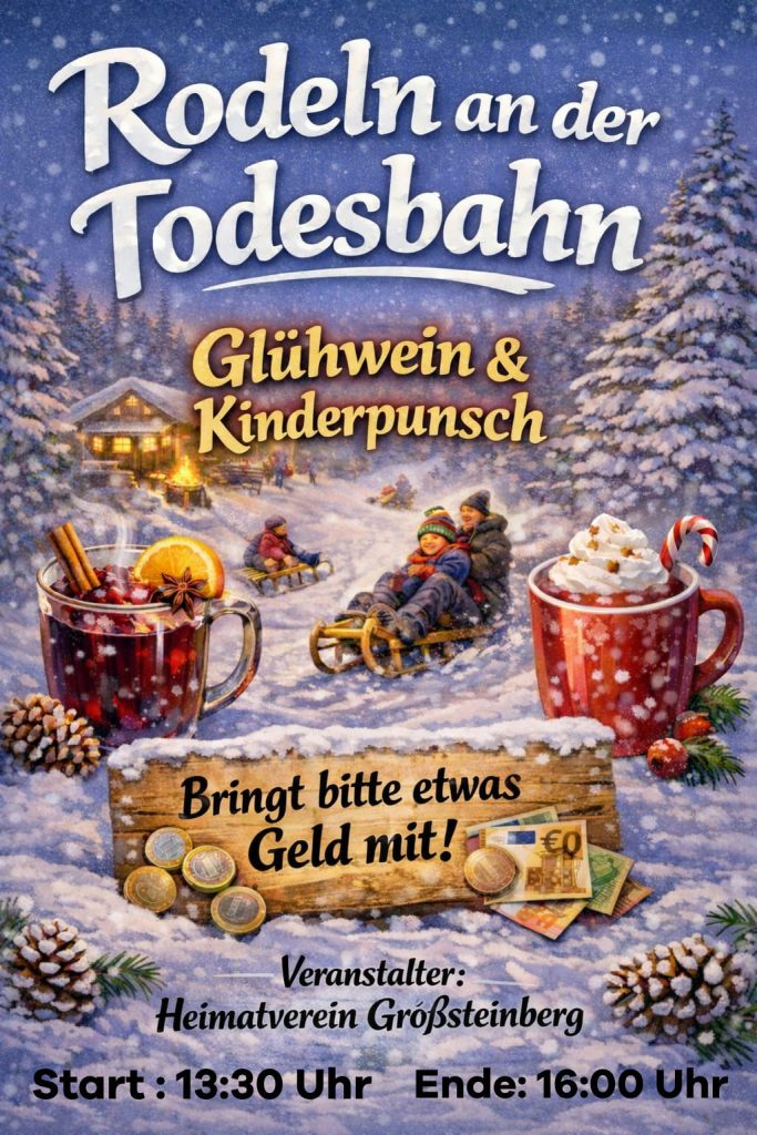 Auf zur T o d e s b a h n – morgen, Sonntag, dem 11. Januar 2026 Veröffentlicht am 10. Januar 2026 von Ortschronist Zum Aufwärmen gibt es Glühwein, Punsch und Tee. Also, nischt wie hin, wer weiß, wann es wieder mal schneit.