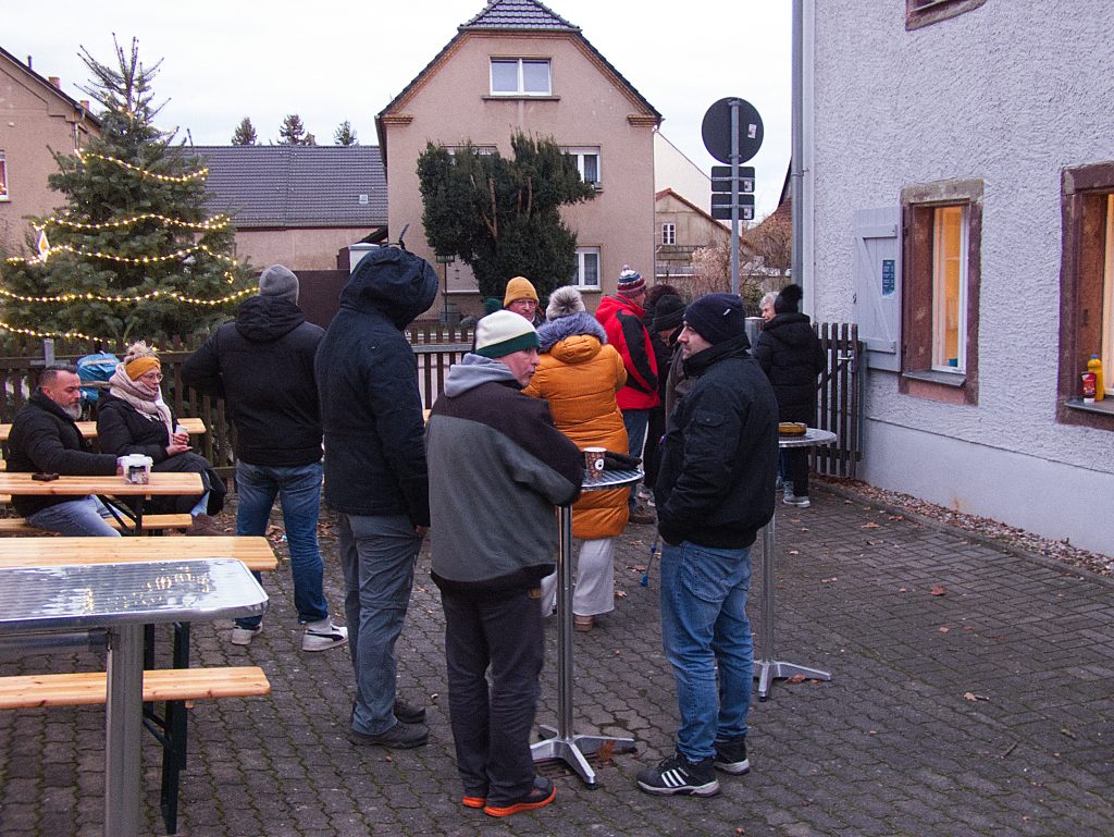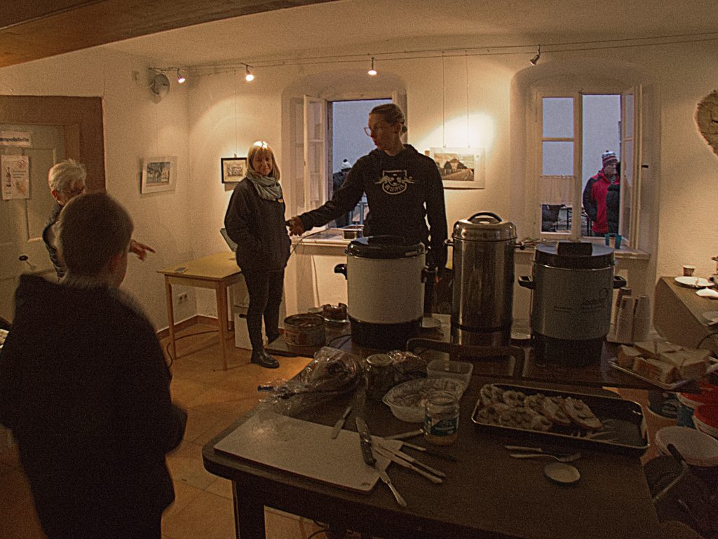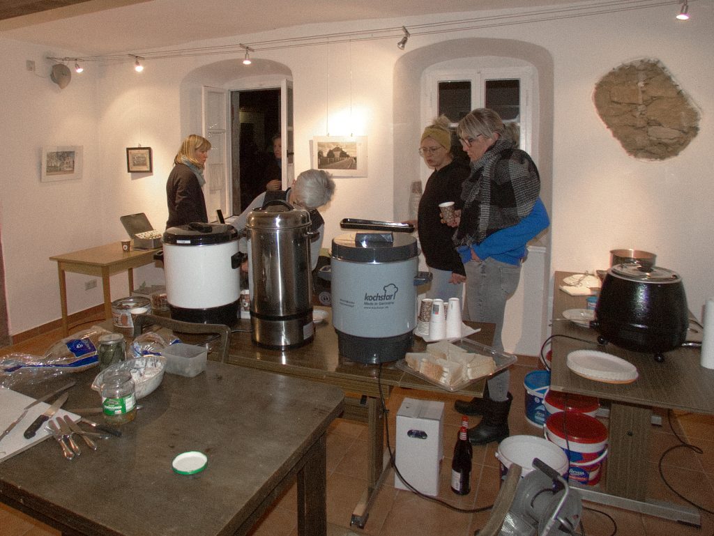 Weil alle anwesenden Mitglieder emsig bei der Sache waren und zugriffen, waren Bänke und Tische schnell aufgebaut. Da es keine Ausstellung gab, konnte die Schulstube für die Zubereitung von Speisen und Getränken sowie für die Ausgabe genutzt werden. Die Organisation lag in den Händen der neuen Mitglieder, hauptsächlich in denen von Claudia Voigt. Und sie war perfekt.